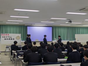 各グループで、今年度学習した職業分野の中で興味のあるものを1つ選び、SDGSを意識してどうすすめていけるかをテーマを決め調査・研究などを行い、パワーポイントを使って5分程度のプレゼンを行いました。
