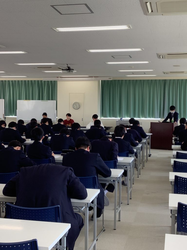 新2・3年生の大学進学コース及び特別進学コースの生徒が出席し、今年度大学に合格した3名の先輩の体験を聞きました(うち1名は病欠につき代理)。