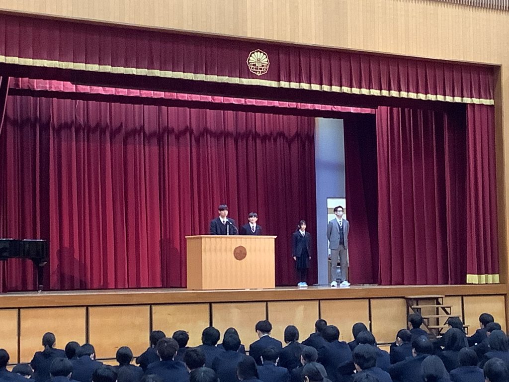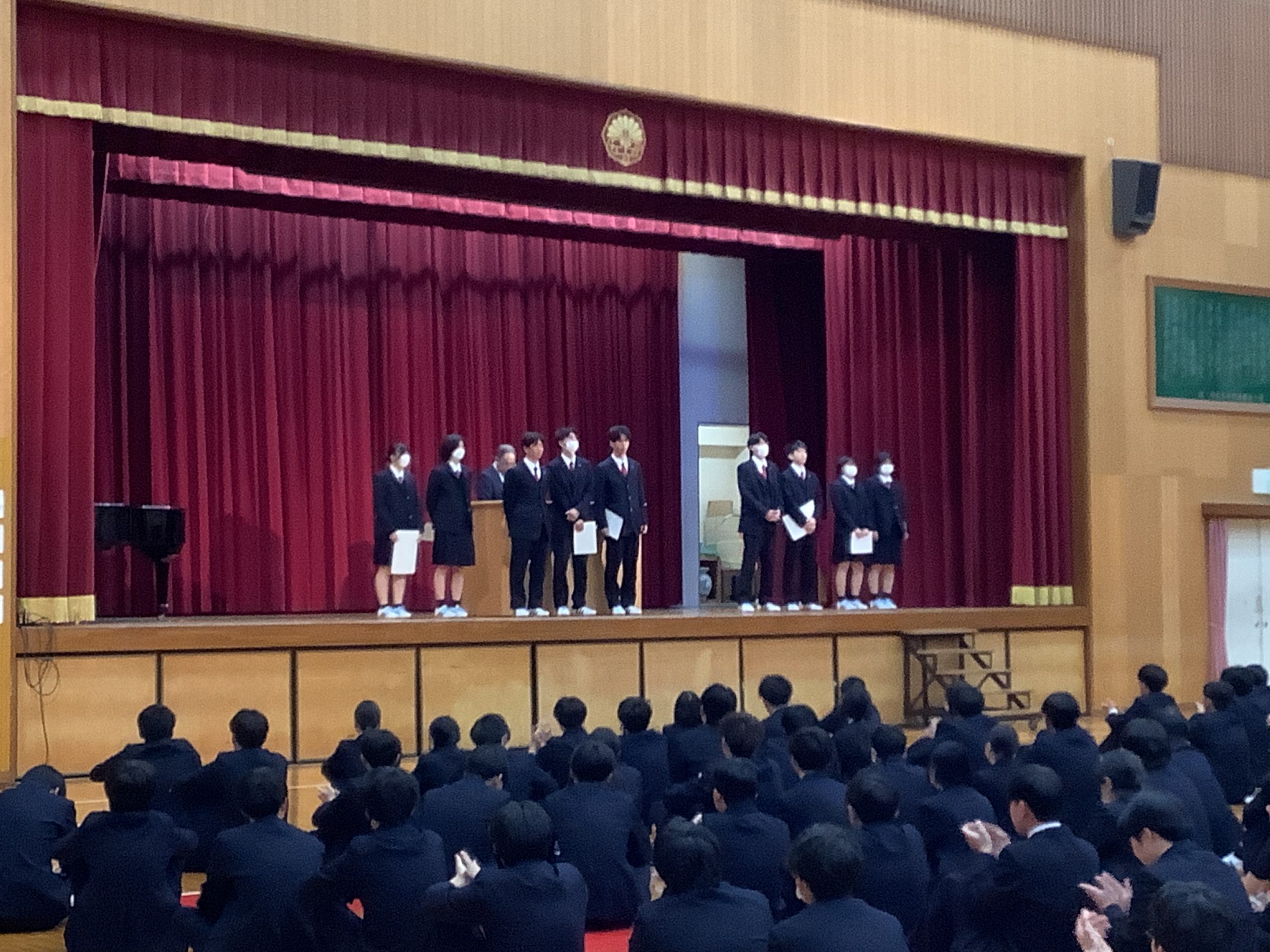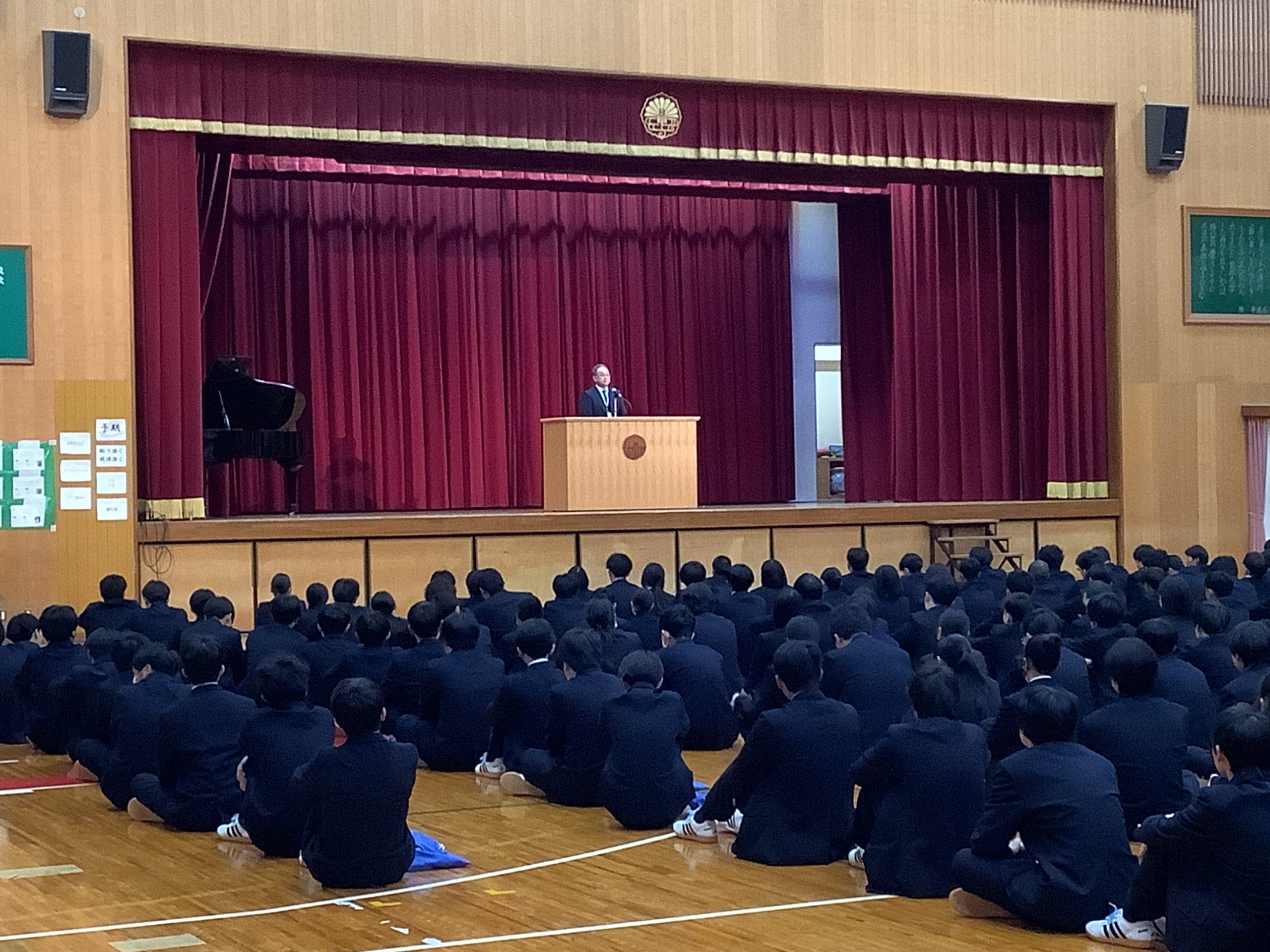 本日、令和7年度の3学期終業式が行われました。校長先生のお話と離任式、その後は各部活動の表彰伝達式、最後にアーチェリー部の全国選抜大会出場の壮行会が行われました。