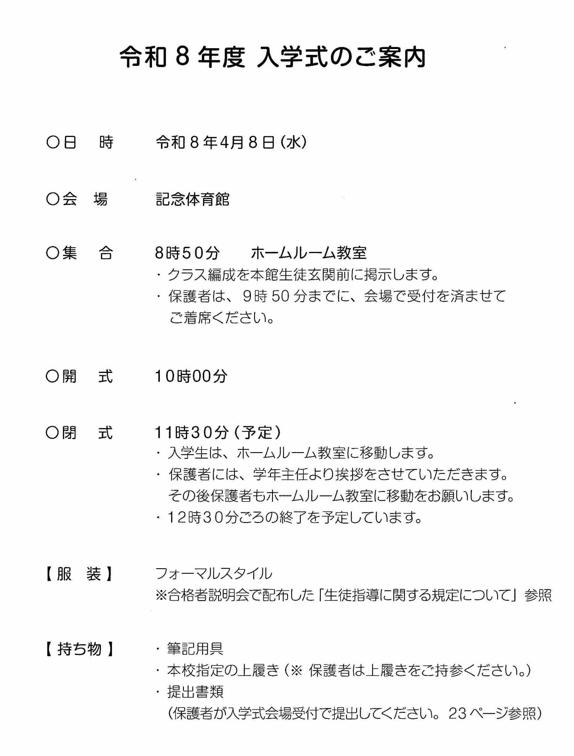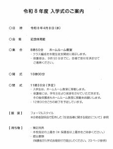 4/8(水)の入学式につきまして、以下の内容を確認し、来校してください。